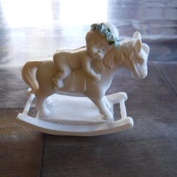 Söt liten baby på gunghäst med blå krans