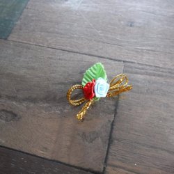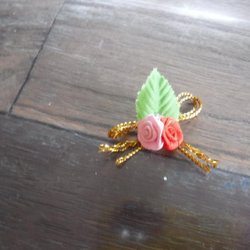 Liten rosett med blommor i tyg och ett litet hänge