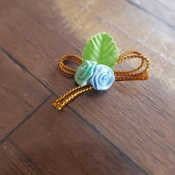 Liten rosett med blommor i tyg och ett litet hänge