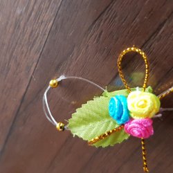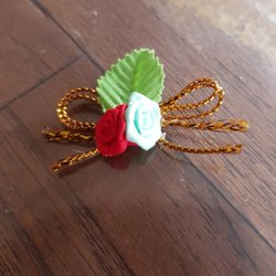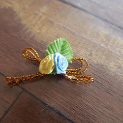 Liten rosett med blommor i tyg och ett litet hänge
