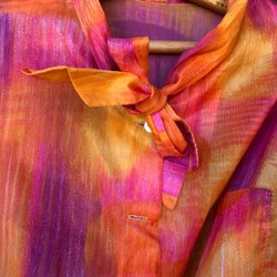 Flerfärgad blus med knytning vid hals.