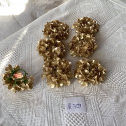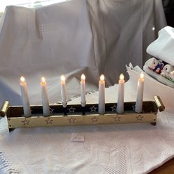 Äldre fungerande adventsljusstake med sju ljus på rad. Gul metall