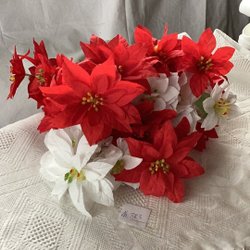 Plastblommor ser ut som julstjärnor röda och vita