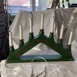 Äldre sjuarmad adventsljusstake i grönt trä. Defekt