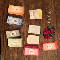 Monopolfigurer, pengar och kort.