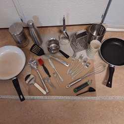 Kökspaket med stekpannor, kaffeburk, termos och köksredskap