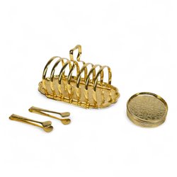 Serveringsset guldfärgad – 9 brickor, 2 tänger, hållare 20 cm