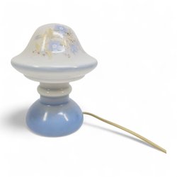 Vintagebordslampa i blåvitt glas med blommotiv – ca 17,5 cm hög