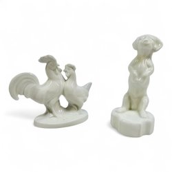 Porslinsfigurer tupp & höna + hund | vit keramik figuriner retro