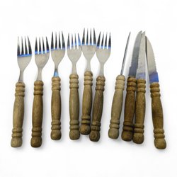 Bestickset i retrostil från Japan – 6 gafflar & 4 knivar, trähandtag, 19 cm
