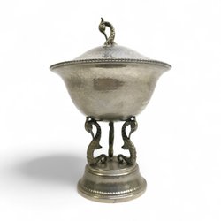 Unik skål med lock i nysilver – Hamrad dekor & havsmotiv – 20 cm