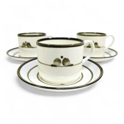 Rörstrand Nordica –3 tekoppar med fat av Jackie Lynd – svensk stengodsklassiker