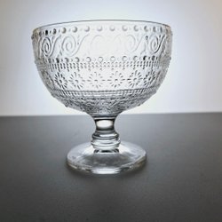 Vintage pressglasskål på fot – 11 cm hög, dekorativ dessertskål i ornamenterat k