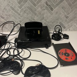 Sega Saturn konsol med två handkontroller och spel