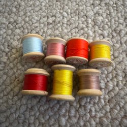 7 antik trätrådrullar i blandade färger