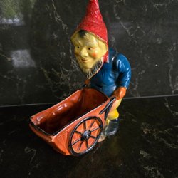 Terrakotta tomte som kör skottkärra.