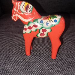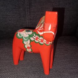 Ovanlig Dalahäst med vridit huvud Nusnäs Mora Röd Trä