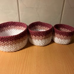 3 stycken nya virkade korgar i vitt och rosa