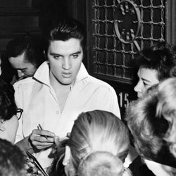 ELVIS PRESLEY SIGNING AUTOGRAPHS SINGER MUSICIAN ACTOR FOTO