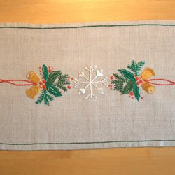 Julbordslöpare med broderade tomtar på oblekt väv.