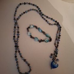 Jättevacker långt halsband o ett fint armband i blå pärlor o stenar