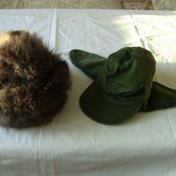 Pälsmössa och grön keps med öronlappar