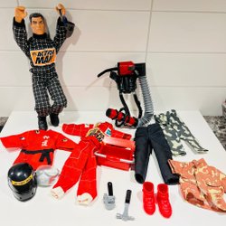 Action Man Figur med olika tillhörande attribut.