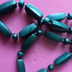 Här ett 80 cm långt halsband i färgen. grön jade, material troligen plast.