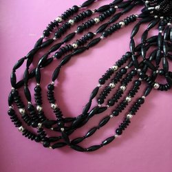 Ett dekorativt, halsband med 5 kedjar, i svart och silver, ca 63 cm långt.