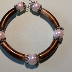 ett egenhändigt gjort armband i färgerna brun, vit och silver.