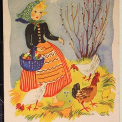 Påskkort. W. Flicka med äggkorg.