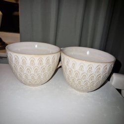 Två beige temuggar med mönster