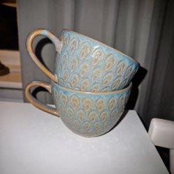 Två blåa temuggar med mönster