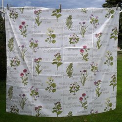 Mönstrat Bomullstyg/duk vit botten med blommor och text 1,33 x 1,43 m