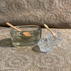 Saltkar med skedar i pressglas