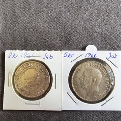 Jubileumsmynt 2 kr 1921 och 5 kr 1966