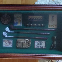 Golf-tavla med miniatyrklubbor och tillbehör
