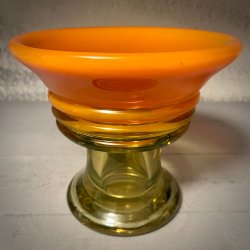 PUKEBERG skål på fot/vas EVA ENGLUND gulgrön ORANGE delvis OPALGLAS Vintage