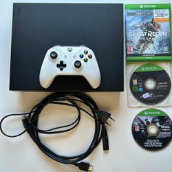 Xbox One X med handkontroll och spel.