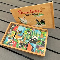 Gammalt kub pussel bilder Aesop's Fables i tillhörande trälåda.