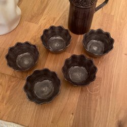Fem Mateus Oyster skålar och Mateus kanna