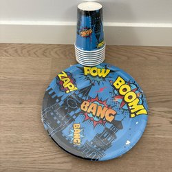Papperstallrikar och muggar med serietidningsmotiv