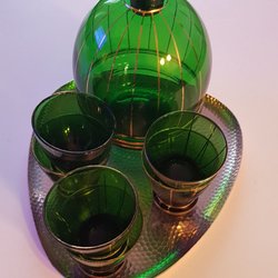 Retro Grön karaff med 6 snapsglas och hamrad bricka