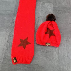 Rött stickat mössa och halsduk