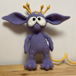 Lila virkad figur med gula detaljer