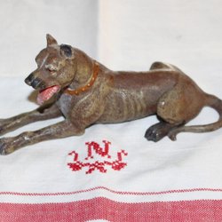 ÄLDRE LIGGANDE HUND KALLMÅLAD METALL.