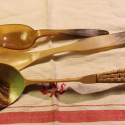 3 ÄLDRE DELAR SKEDAR . TRÄ OCH HORN. EN MED SAMISKT MOTIV.