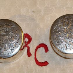 2 ANTIKA DOSOR MED VACKER DEKOR. KONTROLLSTÄMPLAT SILVER E5=1859. C.J.K.