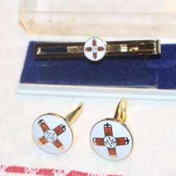 ORDENSÄLLSKAPET DEN XV MARS EMALJERADE MANSCHETTKNAPPAR + SLIPSHÅLLARE MED ETUIR
