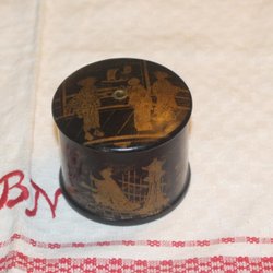 ÄLDRE SNÖRGÖMMA LACKARBETE MED VACKER DEKOR.